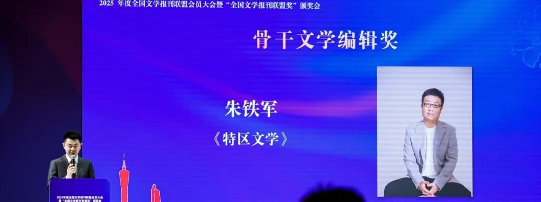 12月3日,2025年度全国文学报刊联盟会员大会暨“全国文学报刊联盟奖”颁奖会在广州隆重举行。深圳市《特区文学》杂志社社长、主编朱铁军凭借深耕文学期刊二十余年的专业坚守与突出实绩,获评“骨干文学编辑奖”,成为本次全国仅有的6名该奖项获得者之一,为深圳文学事业赢得全国性荣誉。